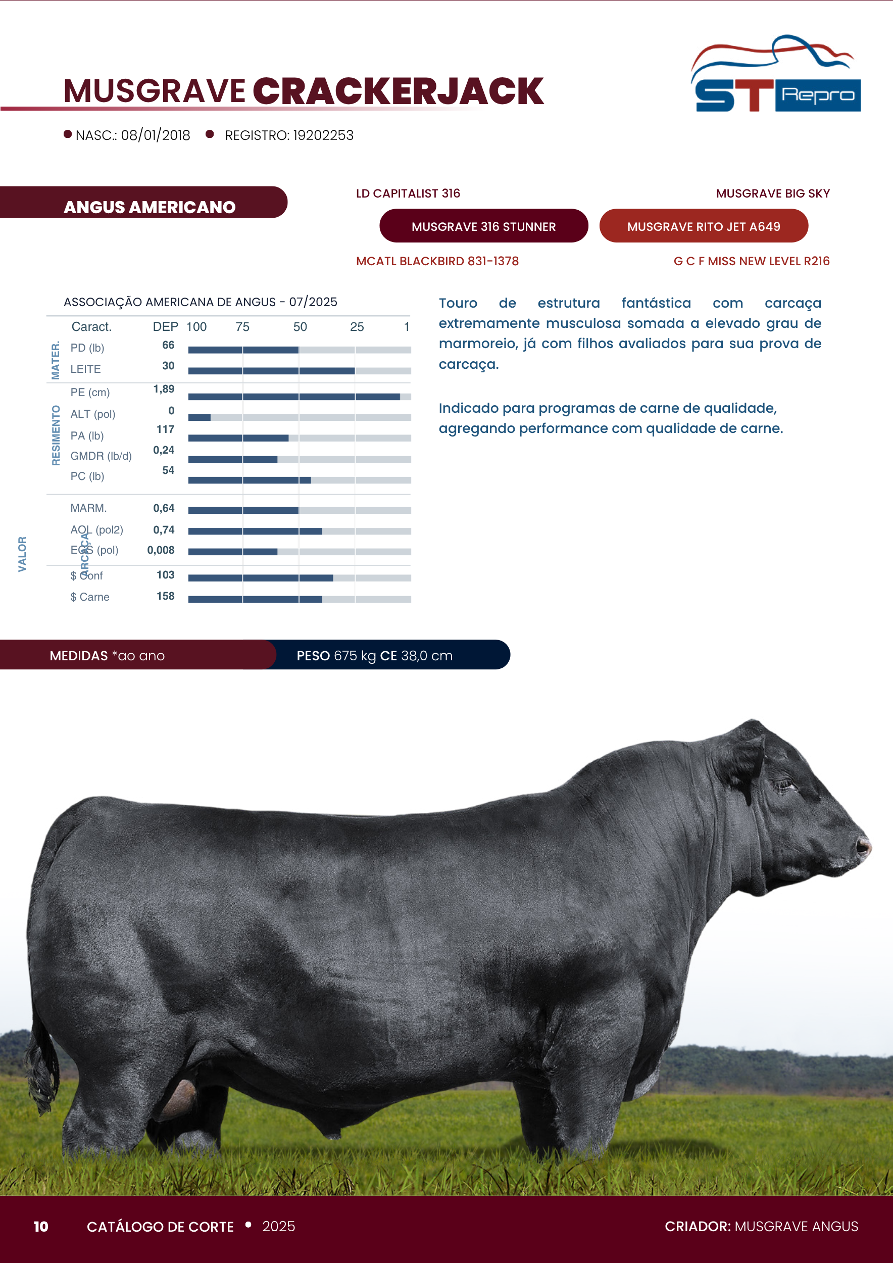 Touro de estrutura fantástica com carcaça extremamente musculosa somada a elevado grau de marmoreio, já com filhos avaliados para sua prova de carcaça / Indicado para programas de carne de qualidade, agregando performance com qualidade de carne.