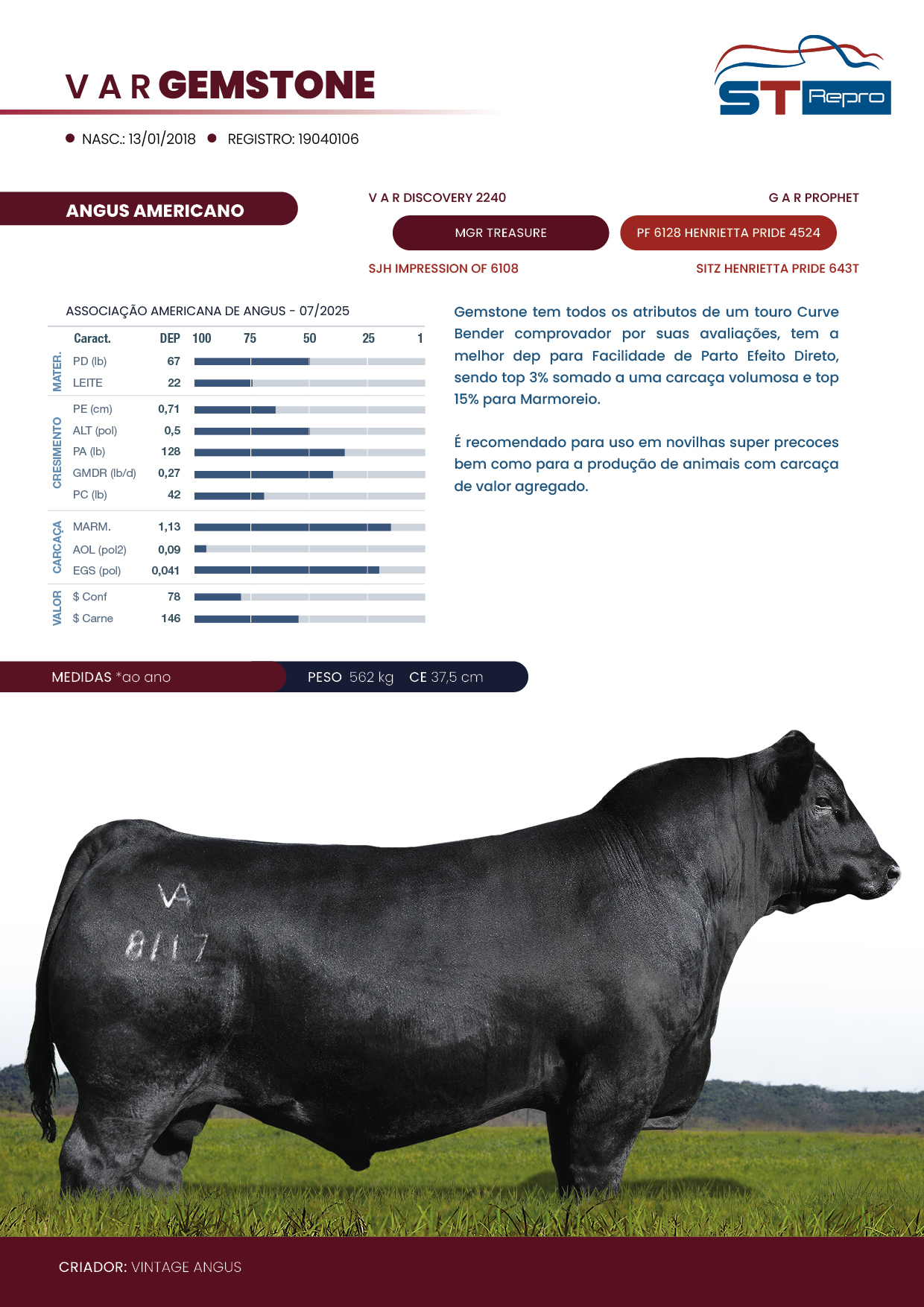Gemstone tem todos os atributos de um touro "Curve Bender" comprovador por suas avaliações, tem a melhor dep para Facilidade de Parto Efeito Direto, sendo top 3% somado a uma carcaça volumosa e top 15% para "Marmoreio".