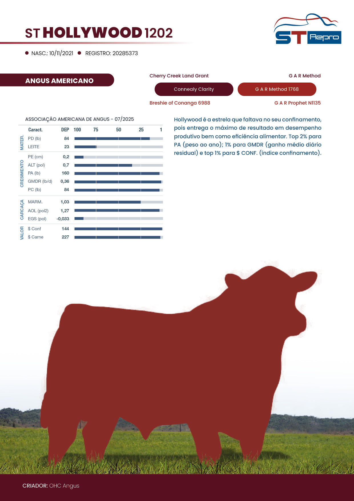 Hollywood é a estrela que faltava no seu confinamento, pois entrega o máximo de resultado em desempenho produtivo bem como eficiência alimentar. Top 2% para PA (peso ao ano); 1% para GMDR (ganho médio diário residual) e top 1% para $ CONF. (índice confinamento).