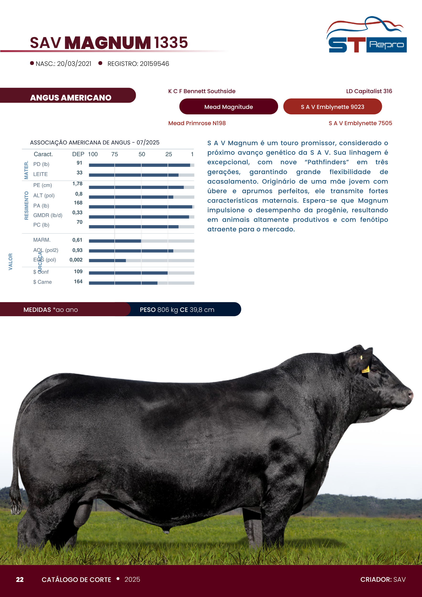S A V Magnum é um touro promissor, considerado o próximo avanço genético da S A V. Sua linhagem é excepcional, com nove "Pathfinders" em três gerações, garantindo grande flexibilidade de acasalamento. Originário de uma mãe jovem com úbere e aprumos perfeitos, ele transmite fortes características maternais. Espera-se que Magnum impulsione o desempenho da progênie, resultando em animais altamente produtivos e com fenótipo atraente para o mercado.