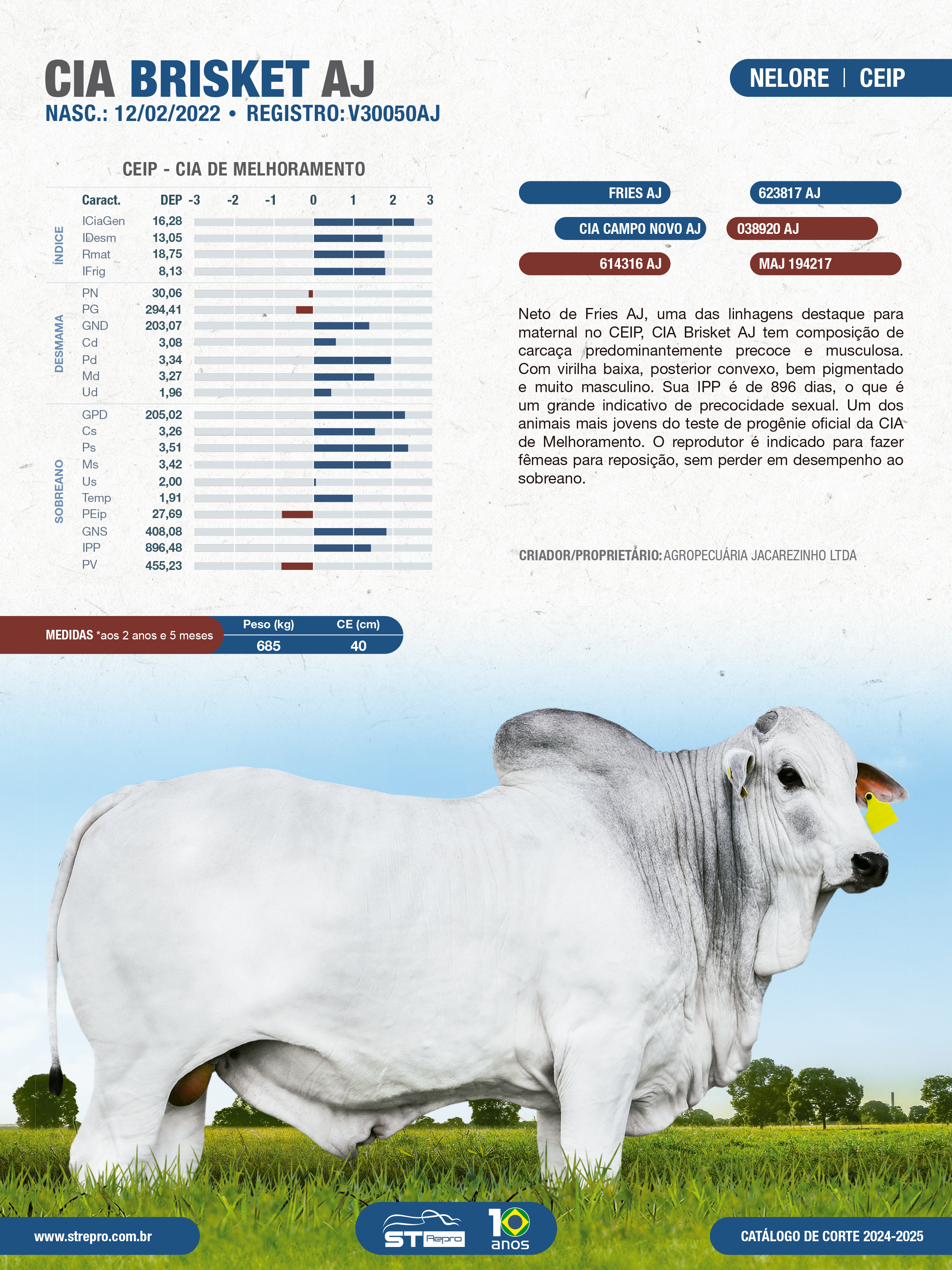 Neto de FRIES AJ, uma das linhagens mais maternais do CEIP, CIA Brisket AJ tem composição de carcaça predominantemente precoce e musculosa. Com virilha baixa, posterior convexo, bem pigmentado e muito masculino. Sua IPP é de 896 dias, o que é um grande indicativo de precocidade sexual.