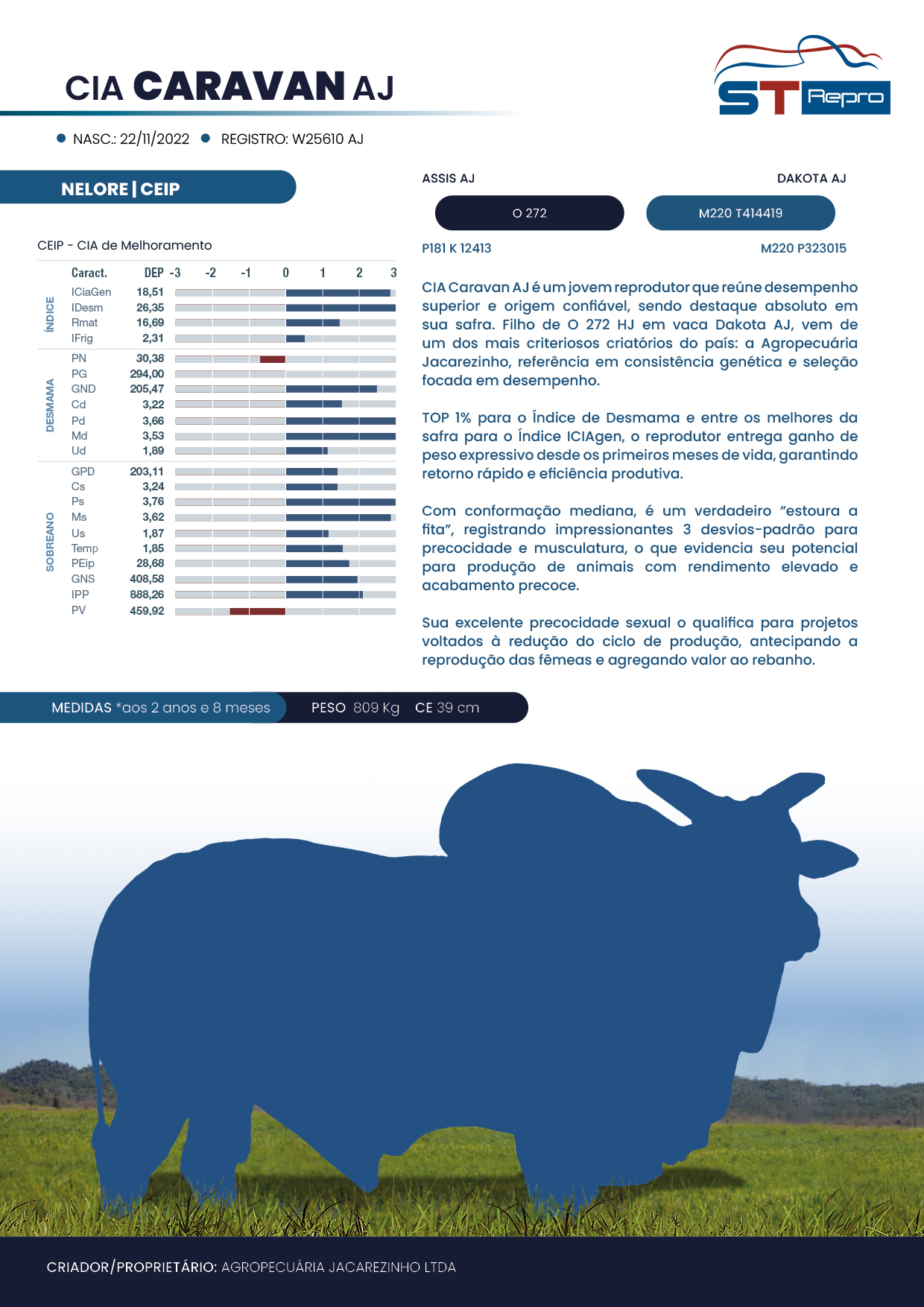 CIA Caravan AJ é um jovem reprodutor que reúne desempenho superior e origem confiável, sendo destaque absoluto em sua safra. Filho do O 272 HJ em vaca Dakota AJ, vem de um dos mais criteriosos criatórios do país: a Agropecuária Jacarezinho, referência em consistência genética e seleção focada em desempenho.