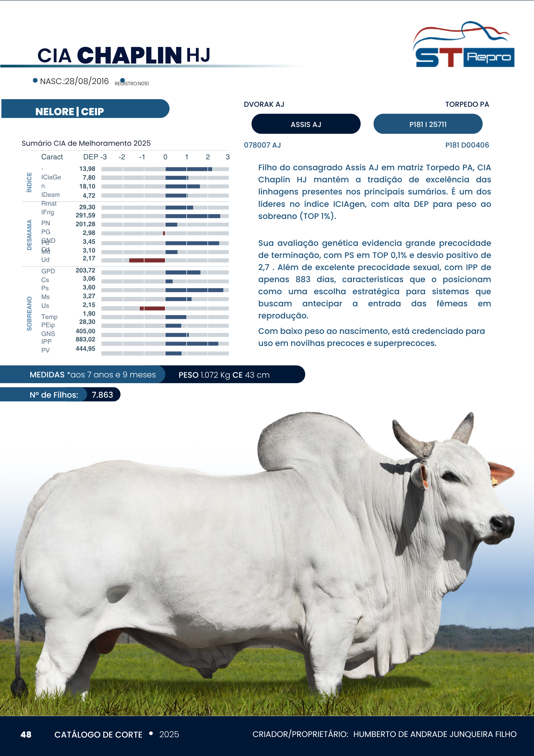 Filho do consagrado Assis AJ em matriz Torpedo PA, CIA Chaplin HJ mantém a tradição de excelência das linhagens presentes nos principais sumários. É um dos líderes no índice ICiaGen, com alta DEP para peso ao sobreano (TOP 1%).