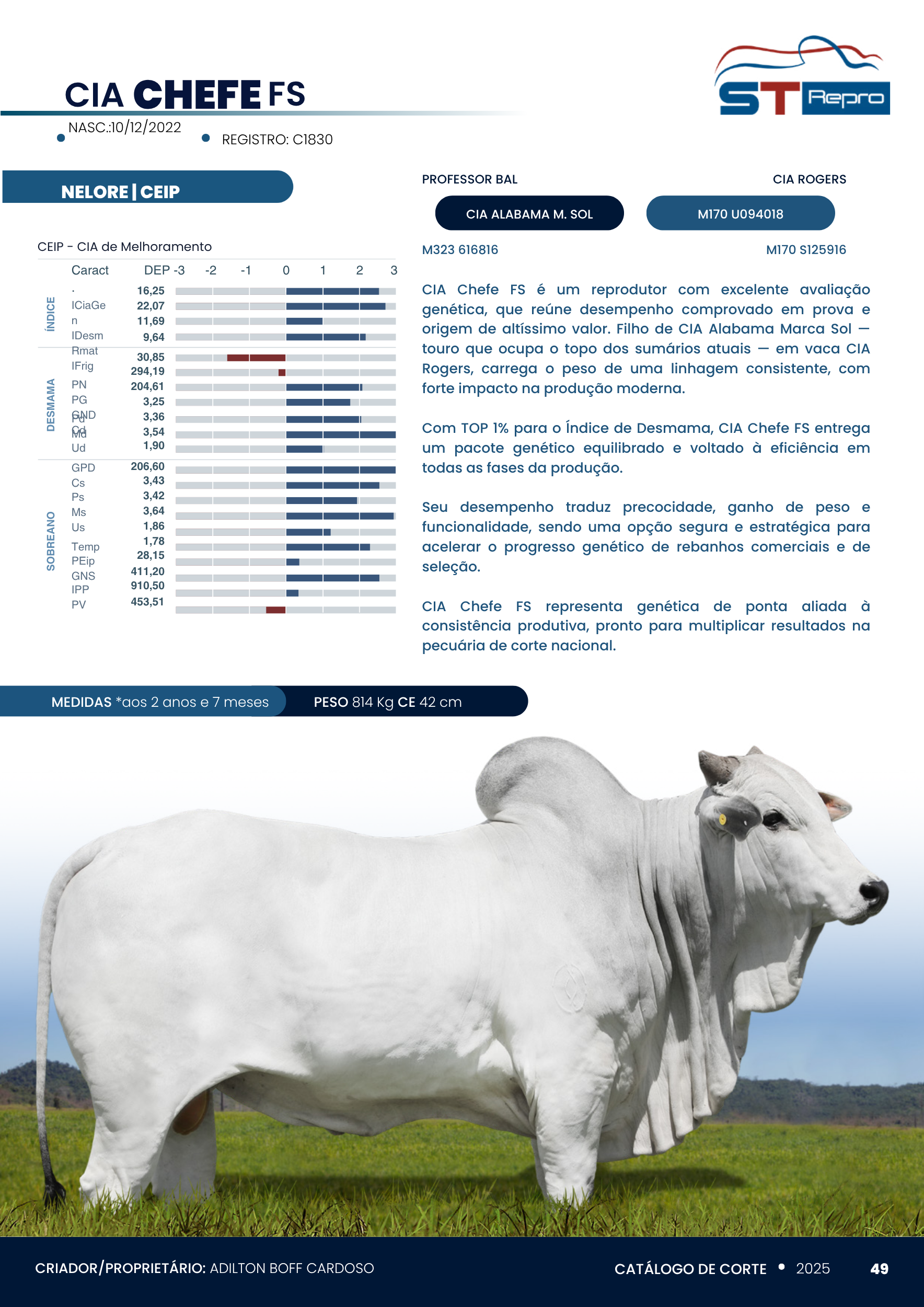 CIA Chefe FS é um reprodutor de excelente avaliação genética, que reúne desempenho comprovado em prova e origem de altíssimo valor. Filho de CIA Alabama Marca Sol, touro que ocupa o topo dos sumários atuais em vaca CIA Rogers, carrega o peso de uma linhagem consistente, com forte impacto na produção moderna.
