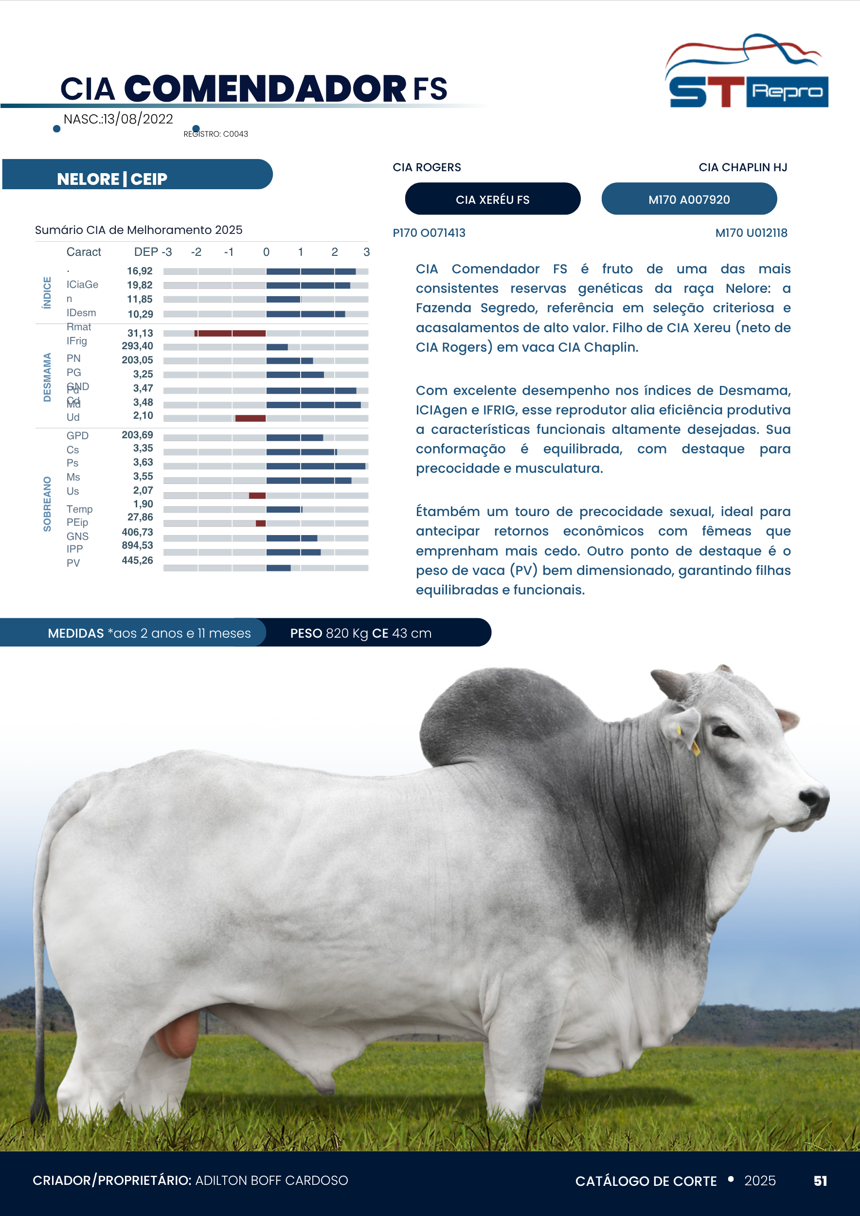 CIA Comendador FS é fruto de uma das mais consistentes reservas genéticas da raça Nelore: a Fazenda Segreda, referência em seleção criteriosa e acasalamentos de alto valor. Filho de CIA Xereu (neto de CIA Rogers), em vaca CIA Chaplin.