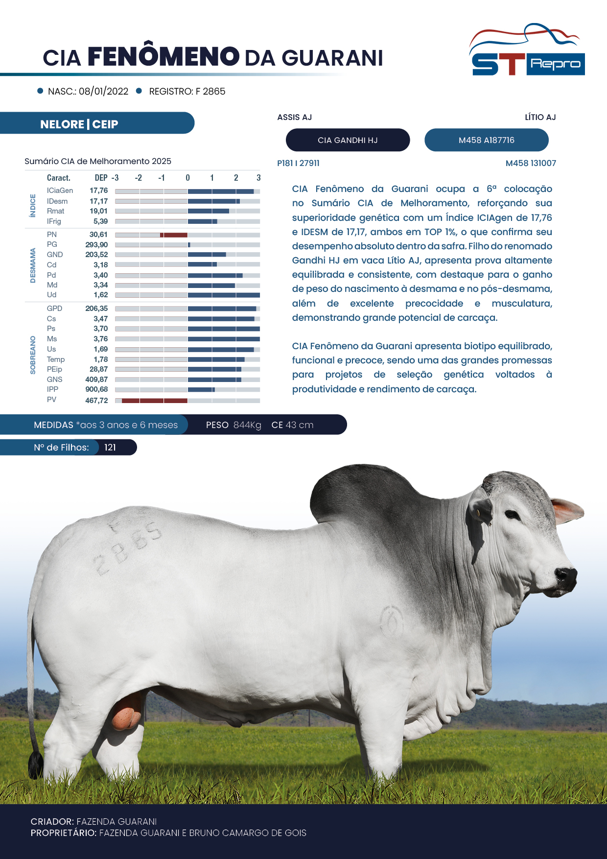 CIA Fenômeno da Guarani ocupa a 6ª colocação no sumário CIA de Melhoramento, reforçando sua superioridade genética com um Índice CIAGen de 17,76 e IDesm de 17,17, ambos em TOP 1%, o que confirma seu desempenho absoluto dentro da safra.