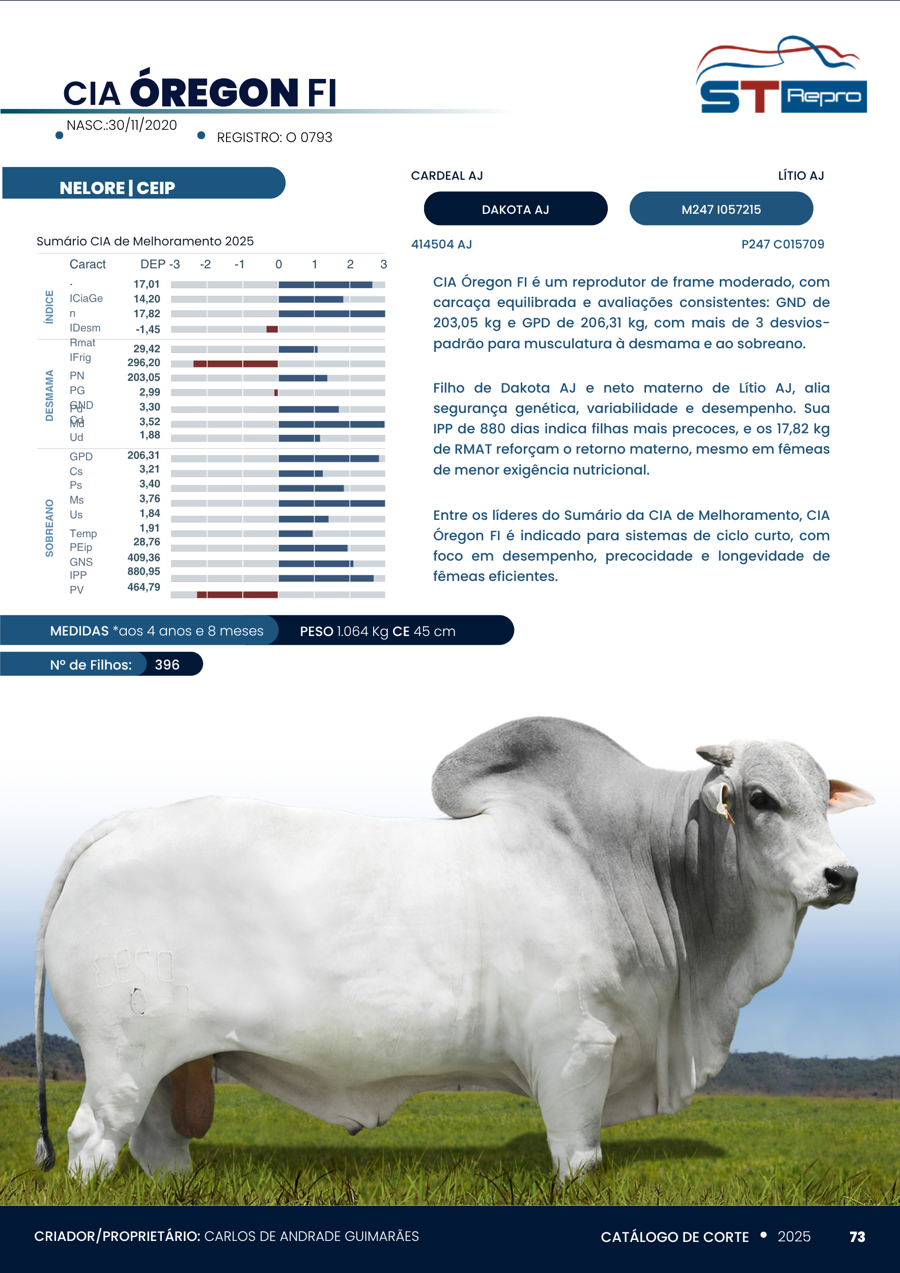 CIA Óregon FI é um reprodutor de frame moderado, com carcaça equilibrada e avaliações consistentes: GND de 203,05 kg e GPD de 206,31 kg, com mais de 3 desvios padrão para musculatura à desmama e ao sobreano.