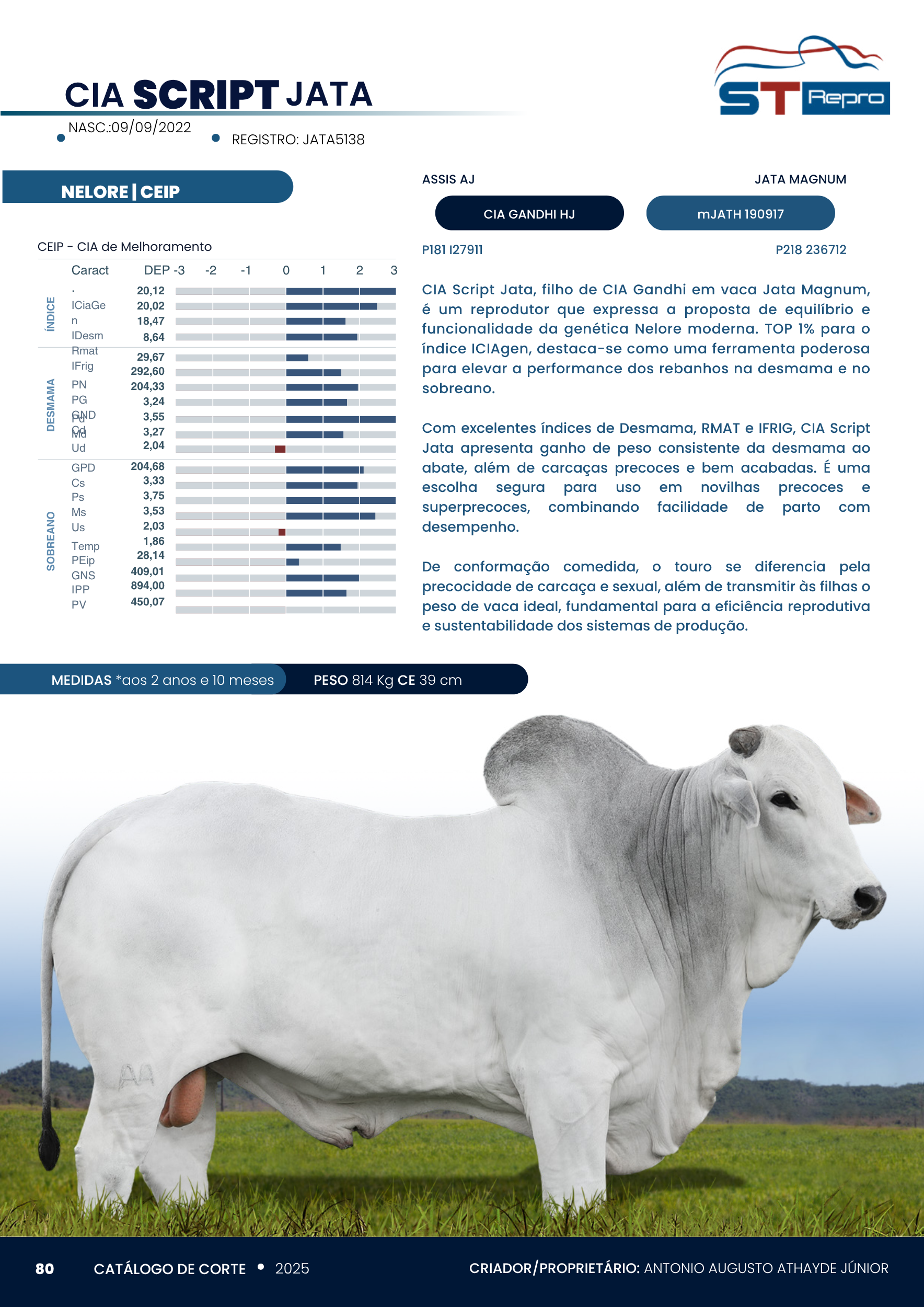 CIA Script Jata, filho de CIA Gandhi em vaca Jata Magnum, é um reprodutor que expressa a proposta de equilíbrio e funcionalidade da genética Nelore moderna. TOP 1% para o índice ICIAgen, destaca-se como uma ferramenta poderosa para elevar a performance dos rebanhos na desmama e no sobreano.