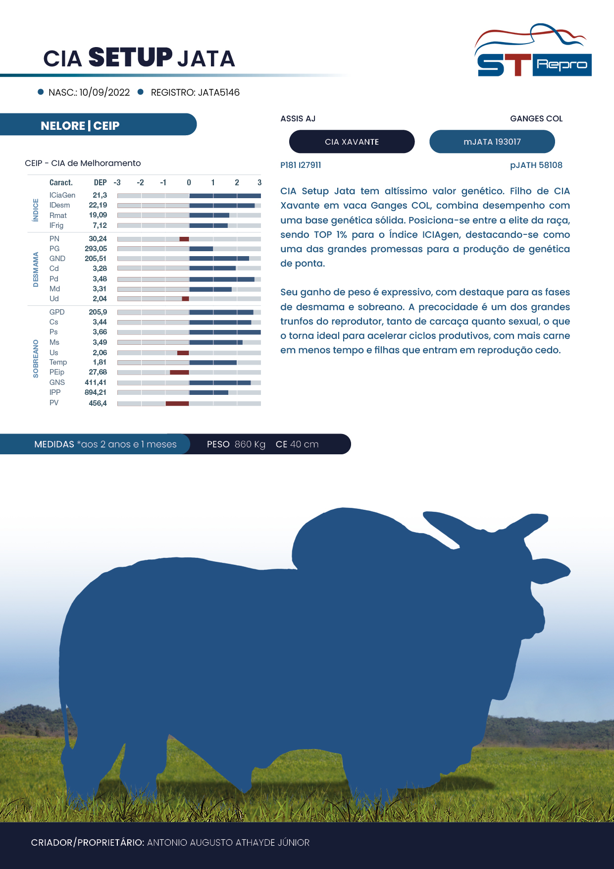 CIA Setup Jata tem altíssimo valor genético. Filho de CIA Xavante em vaca Ganges COL, combina desempenho com uma base genética sólida. Posiciona-se entre a elite da raça, sendo TOP 1% para o Índice ICIAgen, destacando-se como uma das grandes promessas para a produção de genética de ponta.