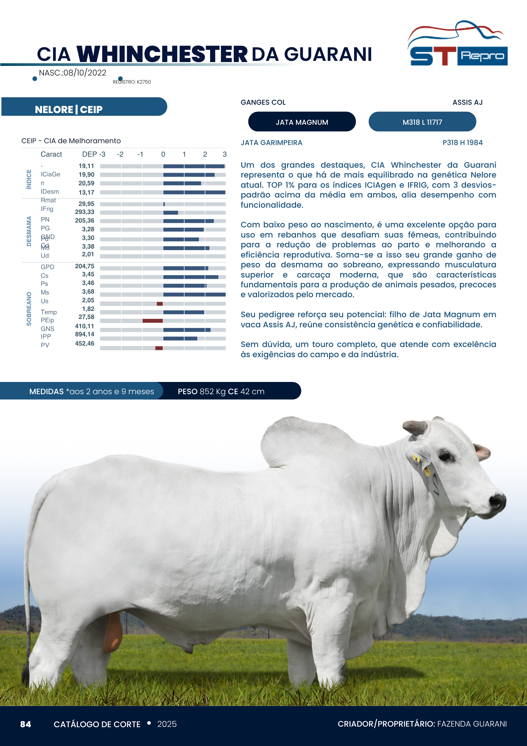 Um dos grandes destaques, CIA Whinchester da Guarani representa o que há de mais equilibrado na genética Nelore atual. TOP 1% para os índices ICIAgen e IFRIG, com 3 desvios padrão acima da média em ambos, alia desempenho com funcionalidade.