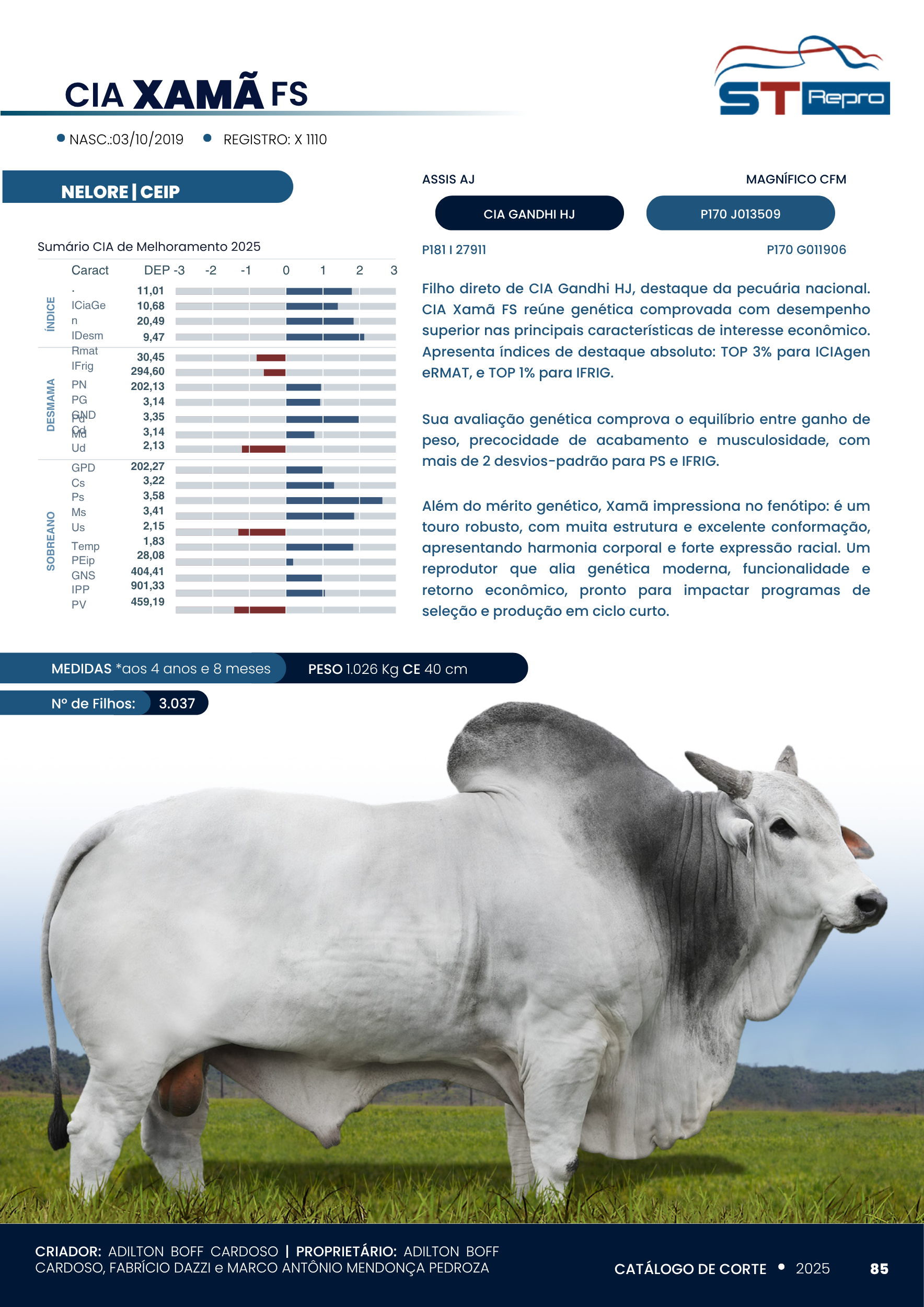 Filho direto de CIA Gandhi HJ, destaque da pecuária nacional. CIA Xamã FS reúne genética comprovada com desempenho superior nas principais características de interesse econômico. Apresenta índices de destaque absoluto: TOP 3% para ICIAgen e RMAT, e TOP 1% para IFRIG.