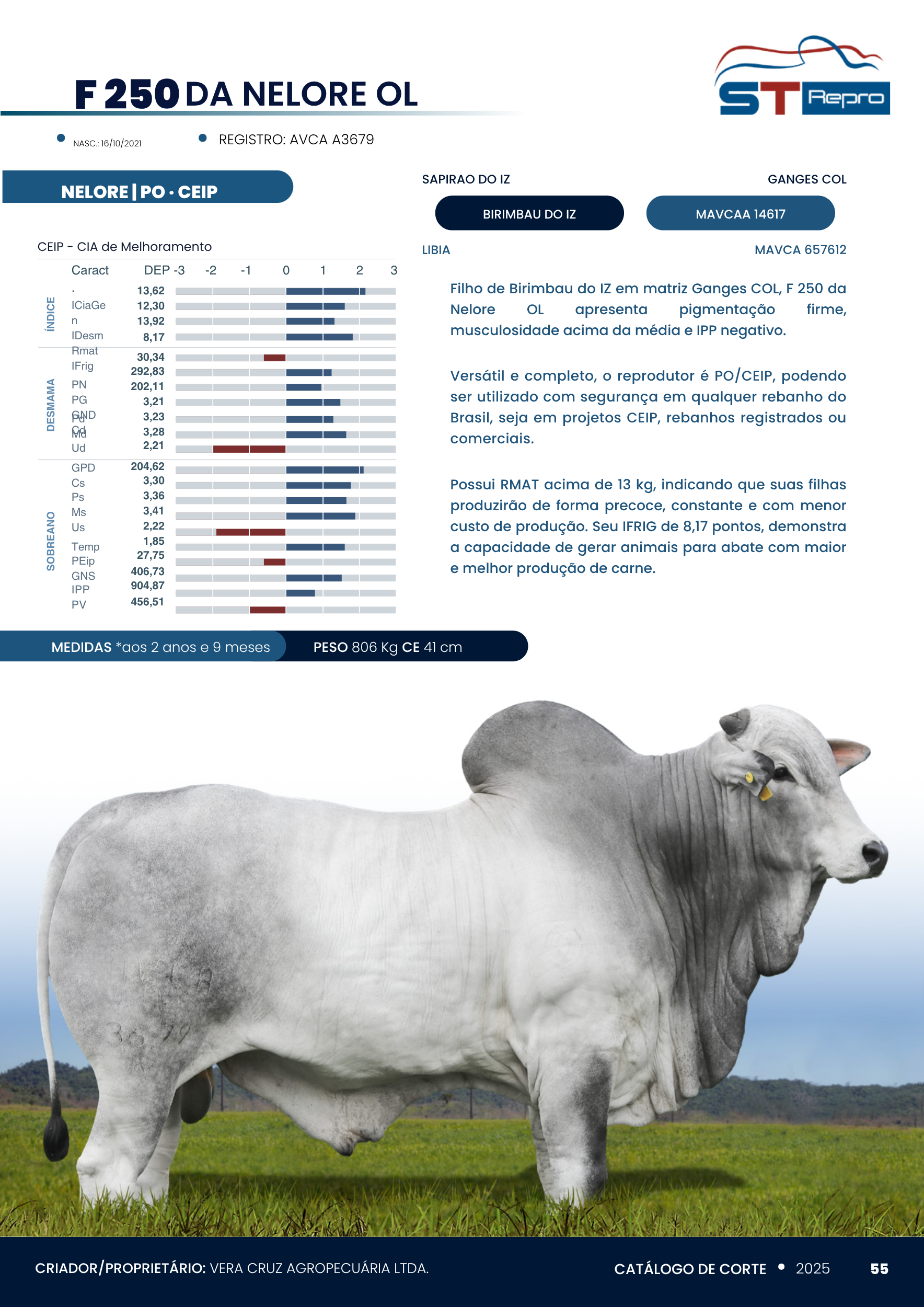 Filho de Birimbau do IZ em matriz Ganges COL, F 250 da Nelore OL apresenta pigmentação firme, musculosidade acima da média e IPP negativo.