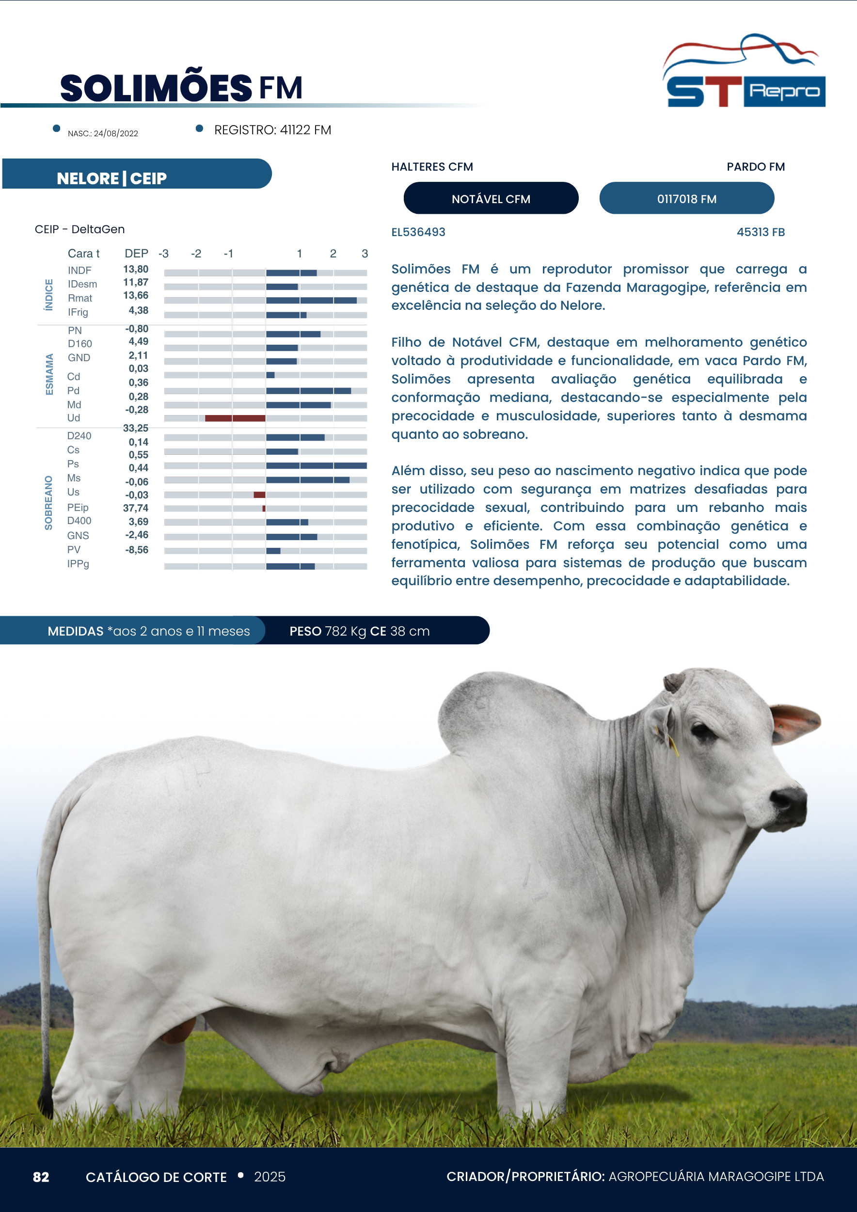 Além disso, seu peso ao nascimento negativo indica que pode ser utilizado com segurança em matrizes desafiadas para precocidade sexual, contribuindo para um rebanho mais produtivo e eficiente. Com essa combinação genética e fenotípica, Solimões FM reforça seu potencial como uma ferramenta valiosa para sistemas de produção que buscam equilíbrio entre desempenho, precocidade e adaptabilidade.