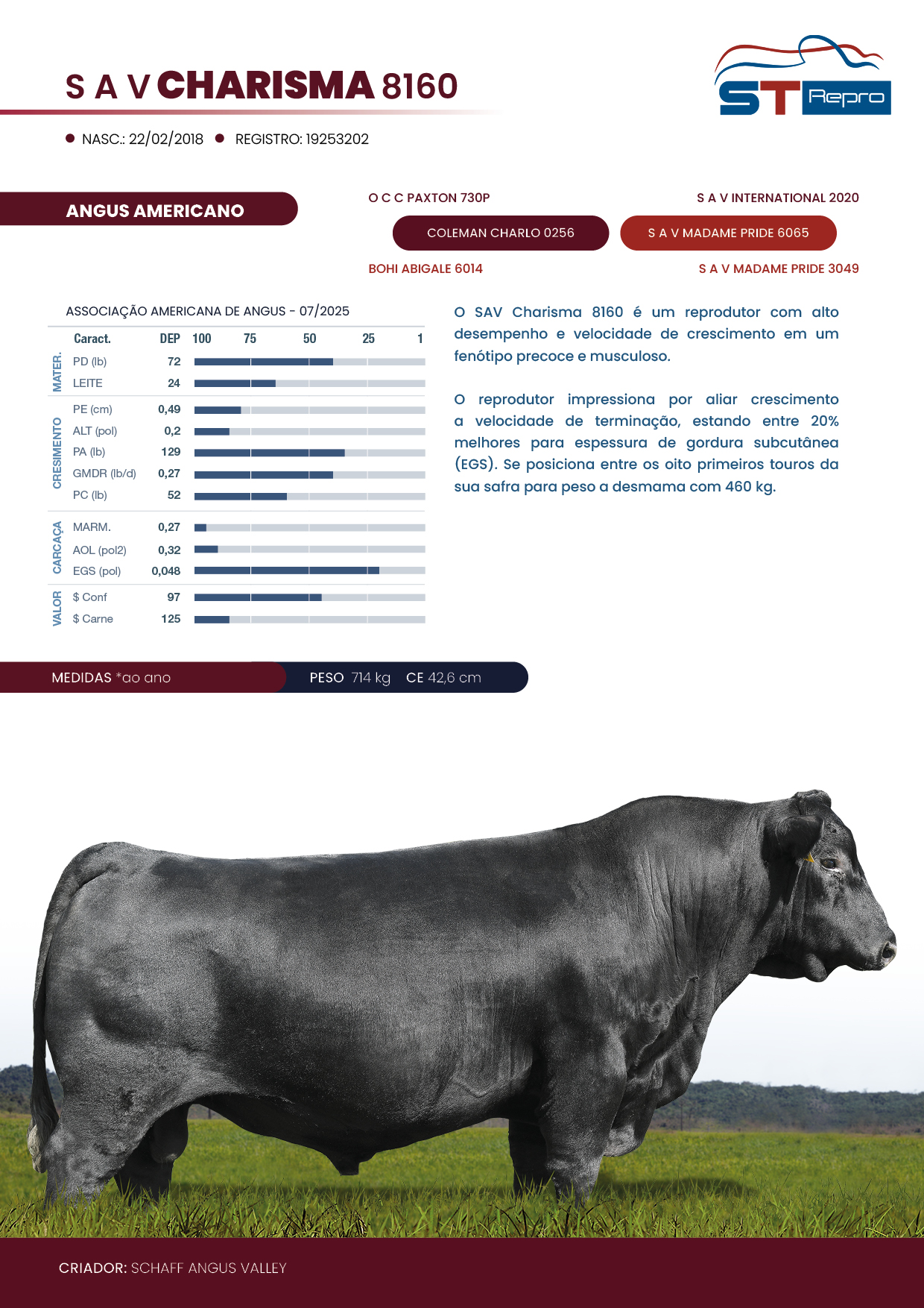 O SAV Charisma 8160 é um reprodutor com alto desempenho e velocidade de crescimento em um fenótipo precoce e musculoso.
