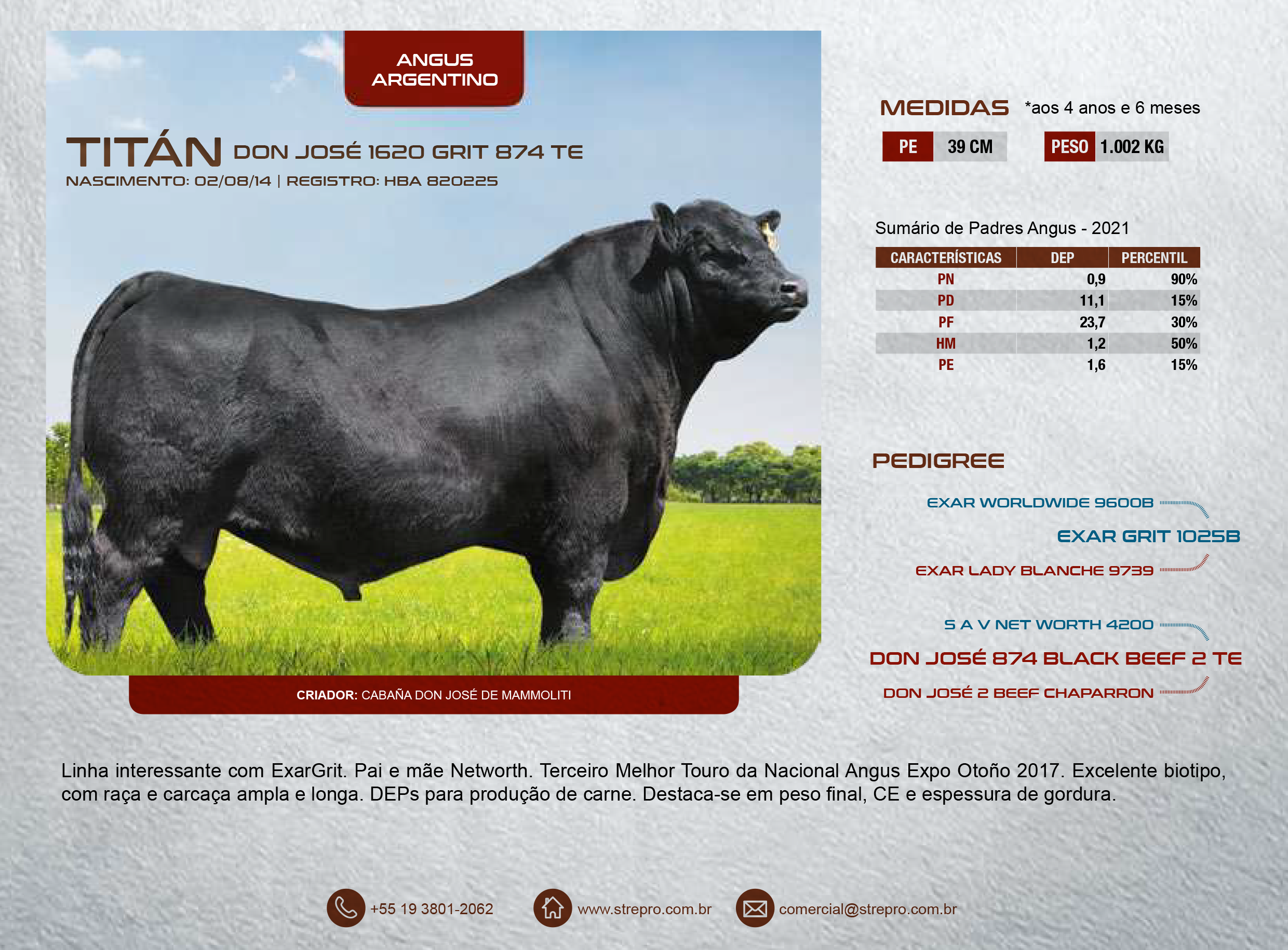 Linha interessante com ExarGrit. Pai e mãe Networth. Terceiro Melhor Touro da Nacional Angus Expo Otoño 2017. Excelente biotipo, com raça e carcaça ampla e longa. DEPs para produção de carne. Destaca-se em peso final, CE e espessura de gordura.