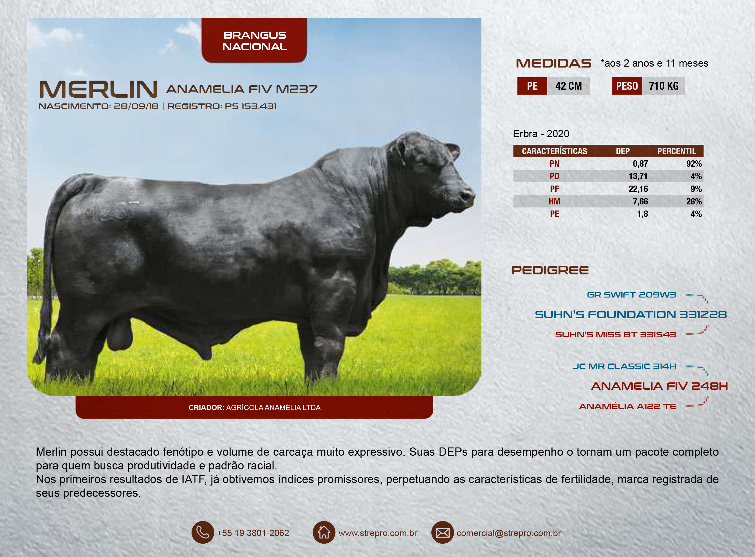 Merlin possui destacado fenótipo e volume de carcaça muito expressivo. Suas DEPs para desempenho o tornam um pacote completo para quem busca produtividade e padrão racial.